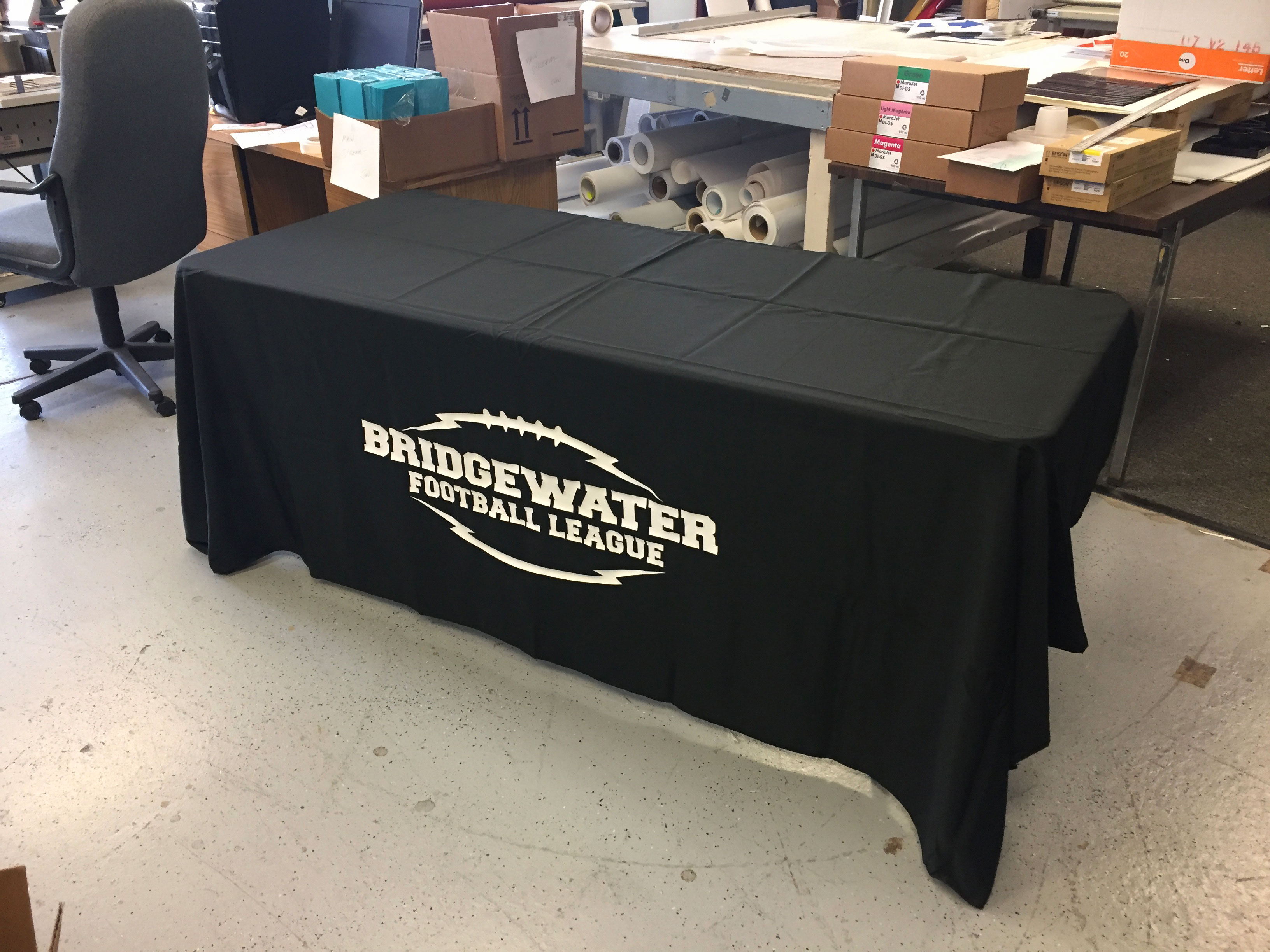 East Coast Media is the source for any style of standard or custom printed table coverings for 8ft, 6ft and 4ft tables. Table throws, skirts and runners help portray a polished and branded appearance at events, trade-shows, street fairs, farmers markets, job fairs and in retail environments.